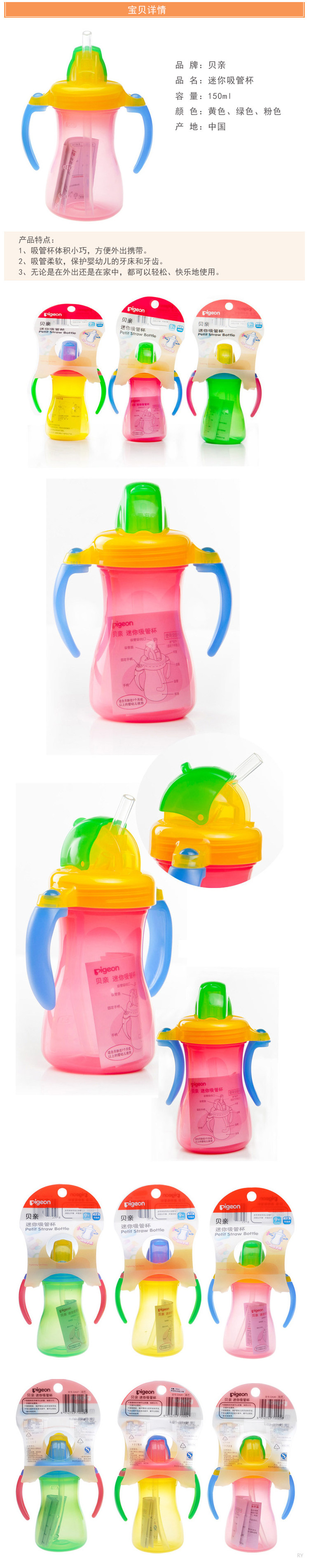 贝亲日本进口饮杯吸管杯带柄
