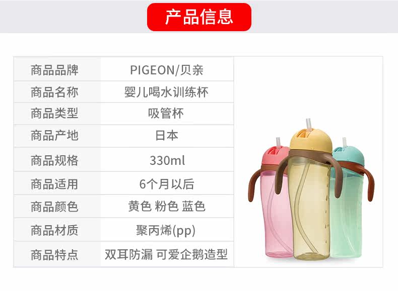 贝亲日本进口饮杯吸管杯带柄
